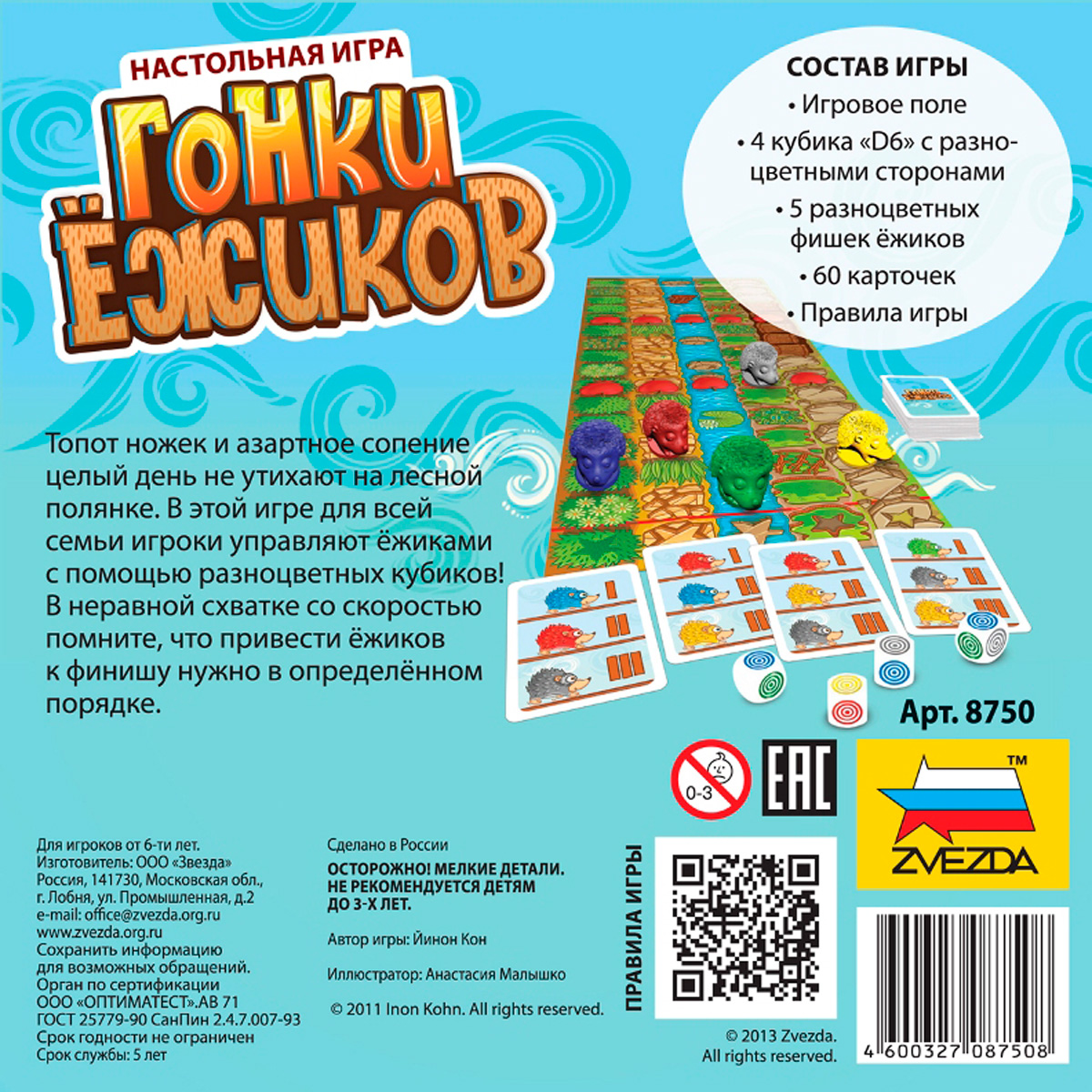 Stolní hra "Gonki ežikov" (od 6 let) je velmi jednoduchá, veselá a pestrá hra. Zde nejde o ježkovu ergonomii, rychlost v zatáčkách a rezervu paliva: vším tím pohybuje paní štěstí. Hoďte kostky, posuňte ježky, sdílejte jablka a dorazte na cíl první!