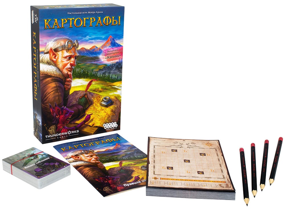 Herní set obsahuje: Zpravodaj kartografa (100 dvoustranných listů-plánovačů), 16 karet pro skórování, 13 karet pro průzkum, 4 karty pasti, 4 karty sezón, 4 karty nařízení, 8 karet dovedností, 4 tužky, Pravidla hry.