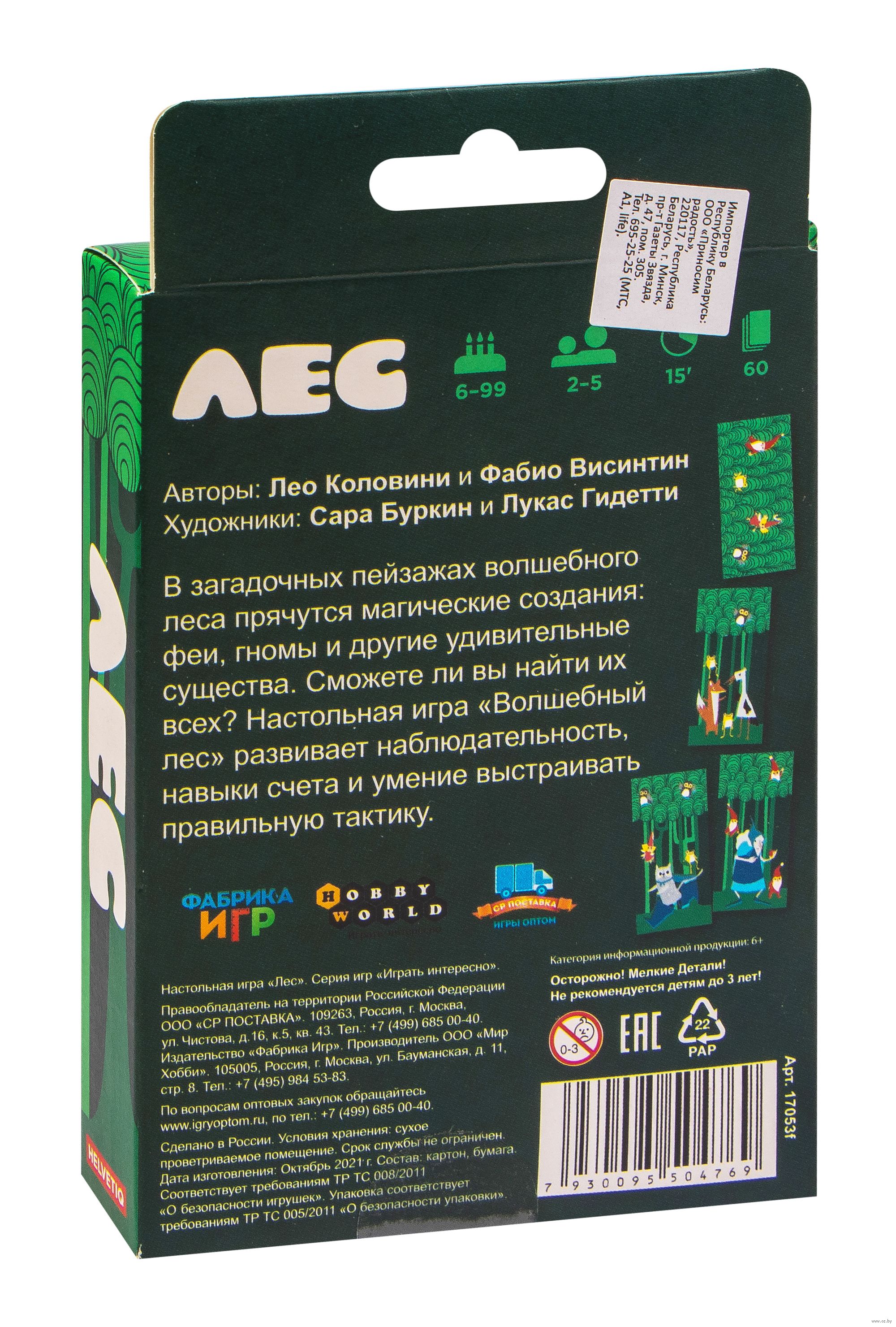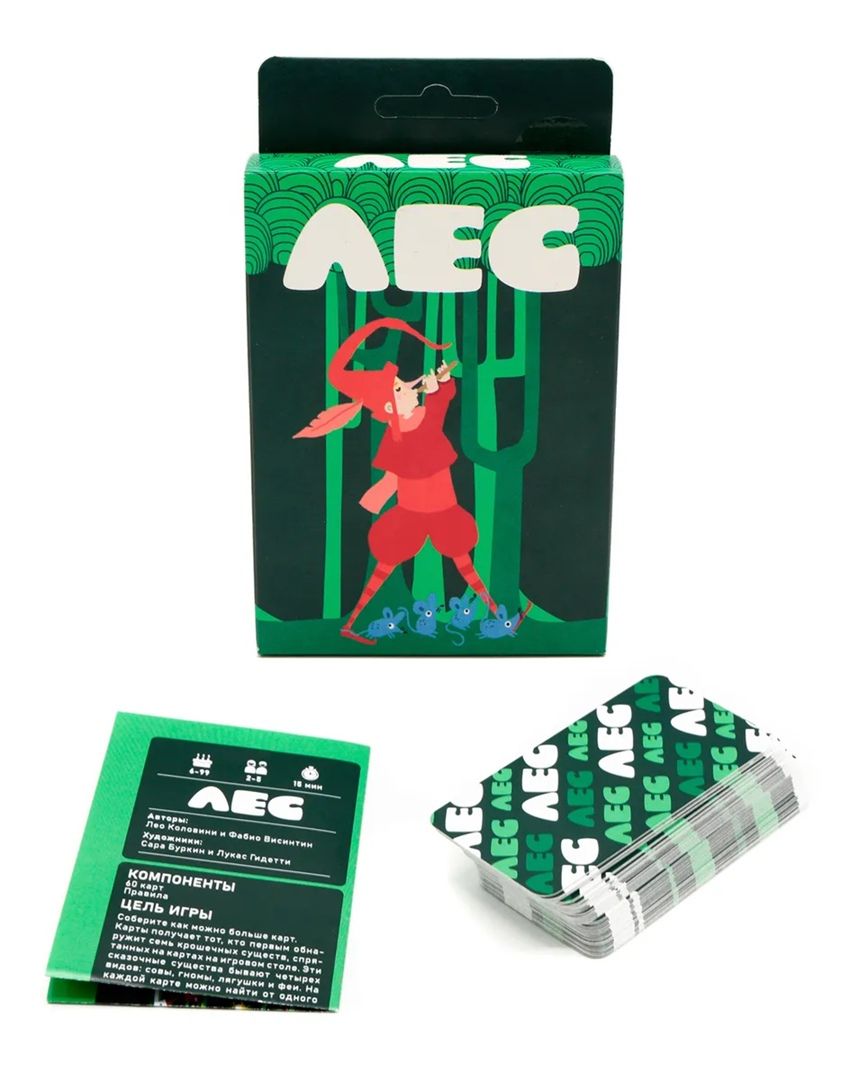Stolní hra "Les" (od 6 let) je jednoduchá a rychlá karetní stolní hra pro děti a jejich rodiče. Pomáhá dětem rozvíjet dovednosti počítání, pozorování a schopnost budovat správnou taktiku. Karty v balíčku představují kmínky a koruny stromů kouzelného lesa, na kterých jsou vyobrazena různá stvoření: víly, žáby, sovy a trpaslíci. Na každé kartě mohou být vyobrazeny ve volném složení a libovolném množství. Na začátku hry každý hráč dostane 3 karty a zbývající vytvoří společný balíček. První hráč položí libovolnou svou kartu, tím začíná les. Poté si vezme kartu ze společného balíčku, aby znovu měl na ruce 3 karty. Poté se tah předá dalšímu hráči ve směru hodinových ručiček. Musíte pečlivě sledovat rychle se rozrůstající les, protože jakmile se v něm objeví 7 (nebo více) stvoření stejného druhu, musíte jako první říct, o jaká stvoření jde! Hráč, který jako první splní tuto podmínku, si vezme všechny karty s těmito stvořeními z lesa - ty se dávají zakryté před hráče a tvoří jeho vítězné body. Hra pokračuje, dokud se karty nevyčerpají ve společném balíčku a na rukou hráčů. Nejpozornější a nejrychlejší hráč, který nasbírá nejvíce karet, se stává vítězem.