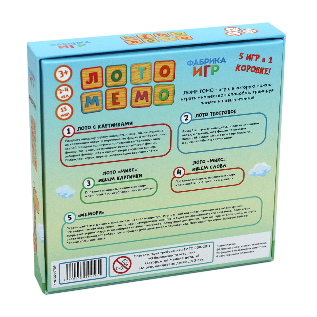 Stolní hra "LotoMemo. Životnye" (od 3 let) je známá hra лото, kterou lze hrát několika způsoby. Společně s dítětem se můžete vydat do světa zvířat a trénovat paměť, obrazné myšlení a dovednosti čtení. V krabici najdete žetony s obrázky a slovy, které označují obyvatele zoo. V tuto hru lze hrát pěti způsoby!