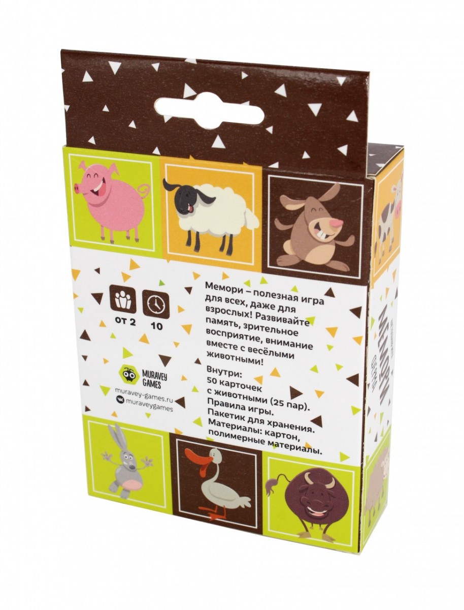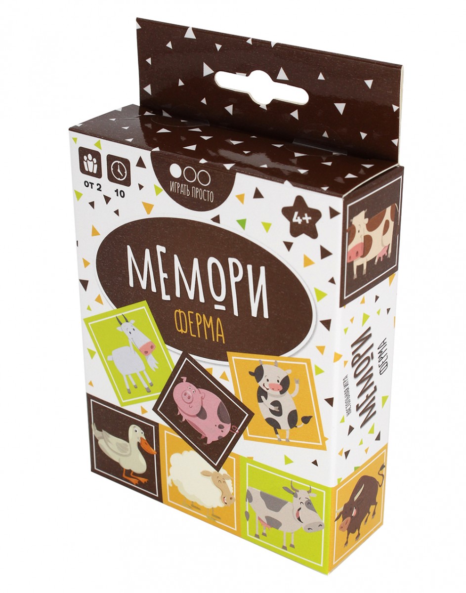 Stolní hra "Memori. Ferma" (od 4 let) je poučna igra pro celou rodinu, která rozvíjí vizuální paměť, pozornost a vnímání. Je to klasická výuková hra s intuitivně srozumitelnými pravidly. Oproti jiným podobným hrám se odlišuje vynikajícím provedením. Každé zvířátko má svůj vlastní charakter.