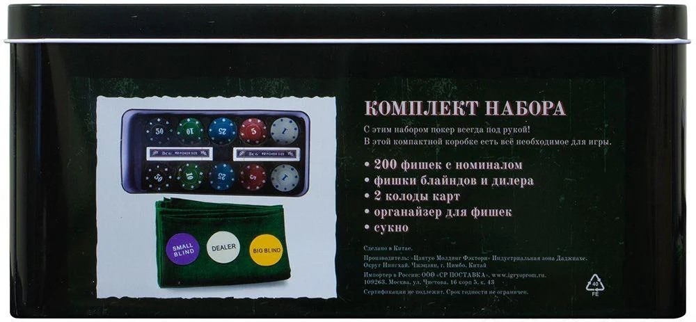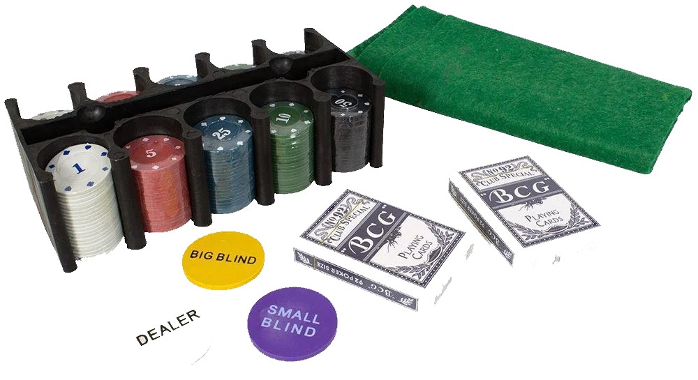 Obsah sady: 200 žetonů hodnoty 1, 5, 10, 25 a 50 jednotek, žetony blindů a dealera, 2 balíčky po 54 kartách, organizátor na žetony, plátno