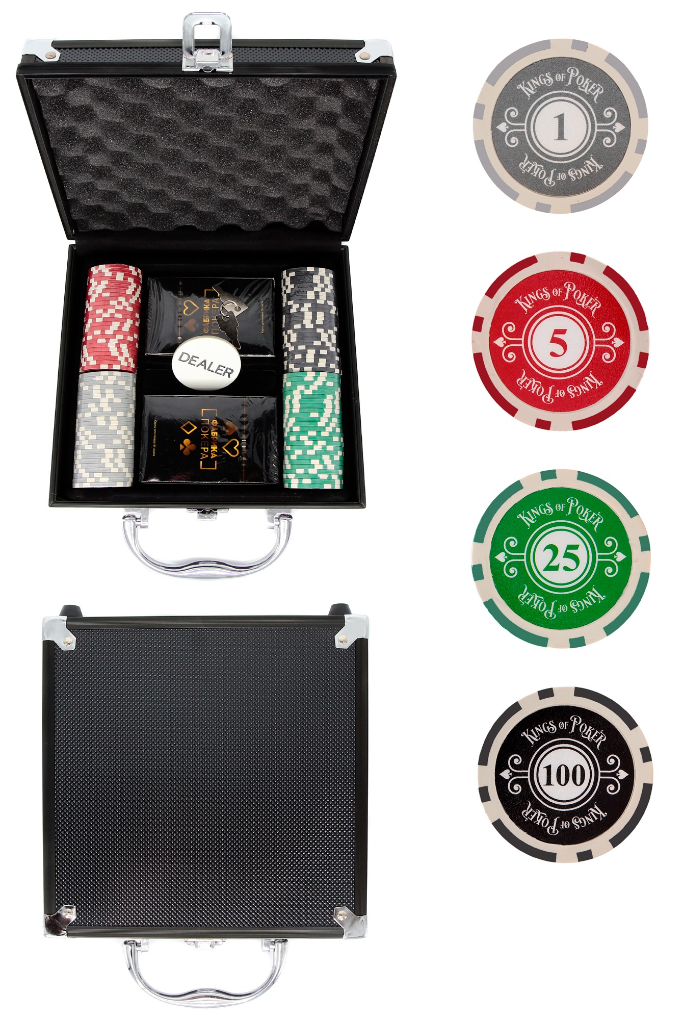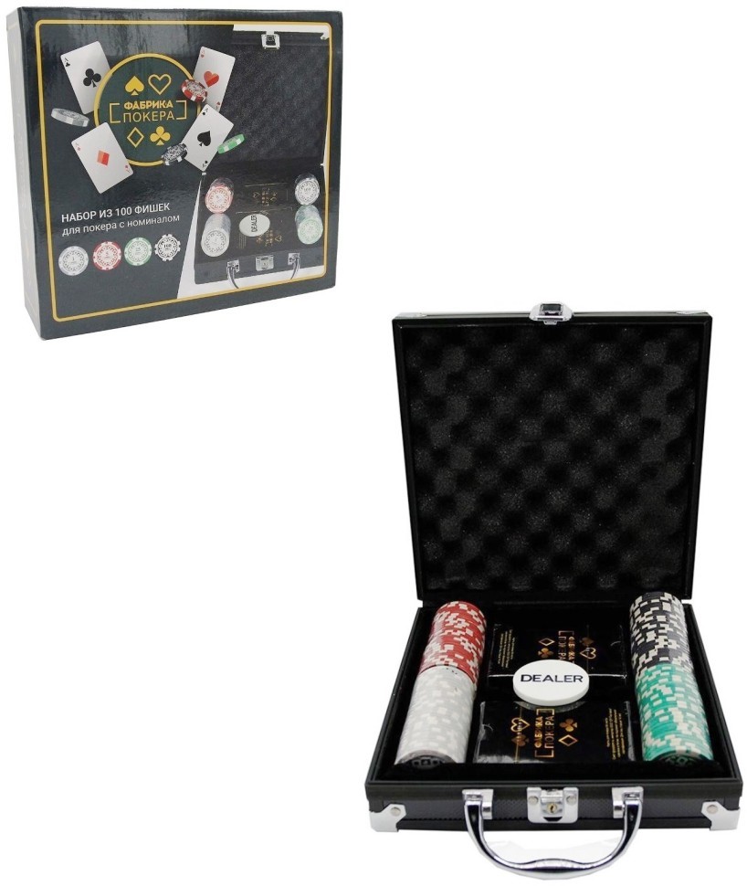 Herní set obsahuje: 100 žetonů s nominály 1, 5, 25, 100, 2 balíčky ze 54 kartonových lesklých karet (standardní velikost karet pro poker - 63x88 mm, index střední velikosti), žeton pro krupiéra, 2 klíče pro kufřík.