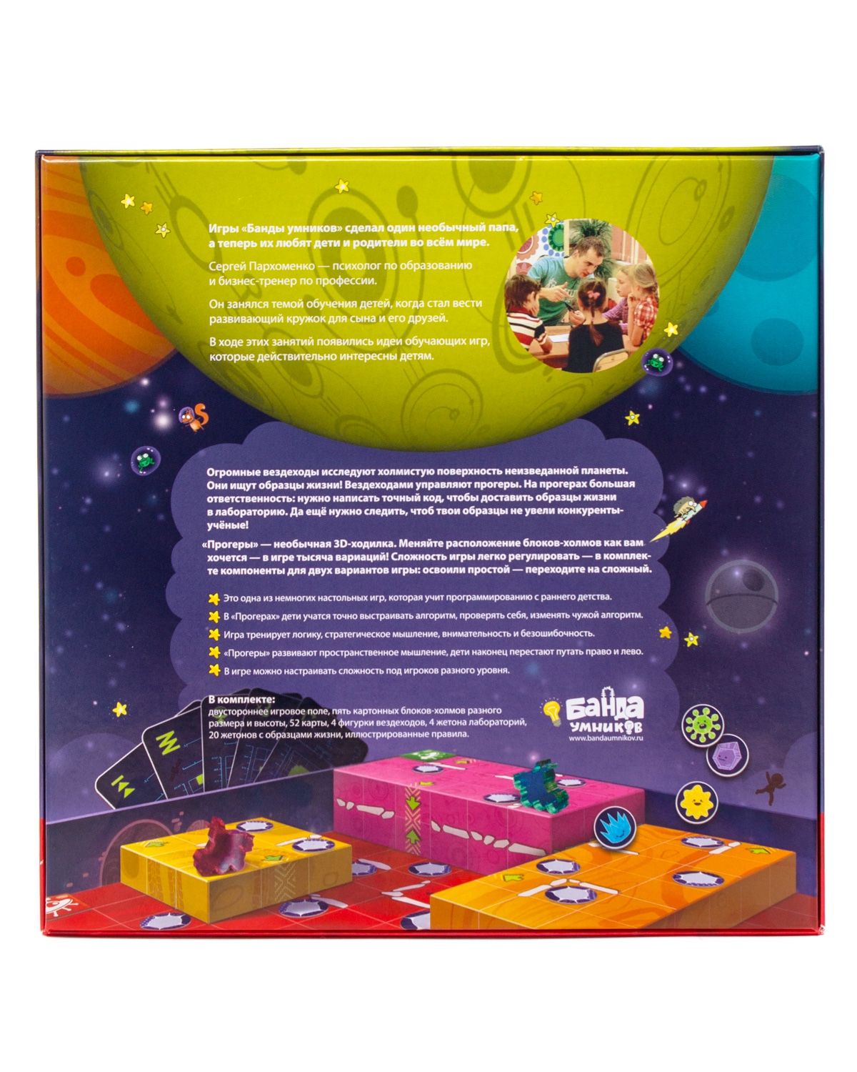 Stolní hra "Progery" (od 6 let) je jednou z mála stolních her, která učí programování od raného dětství. S touto hrou se děti naučí, co jsou algoritmy, jak je sestavovat a jak je používat v praxi při ovládání terénních vozidel na víceúrovňovém poli. Hra trénuje logiku, strategické myšlení, pozornost a představivost.