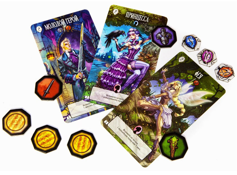 Obsah balení: 48 herních karet; 6 karet úkolů; 66 žetonů bodů; 8 zlatých mincí; 4 meče; 4 brnění; 4 kouzelné hůlky; pravidla hry.