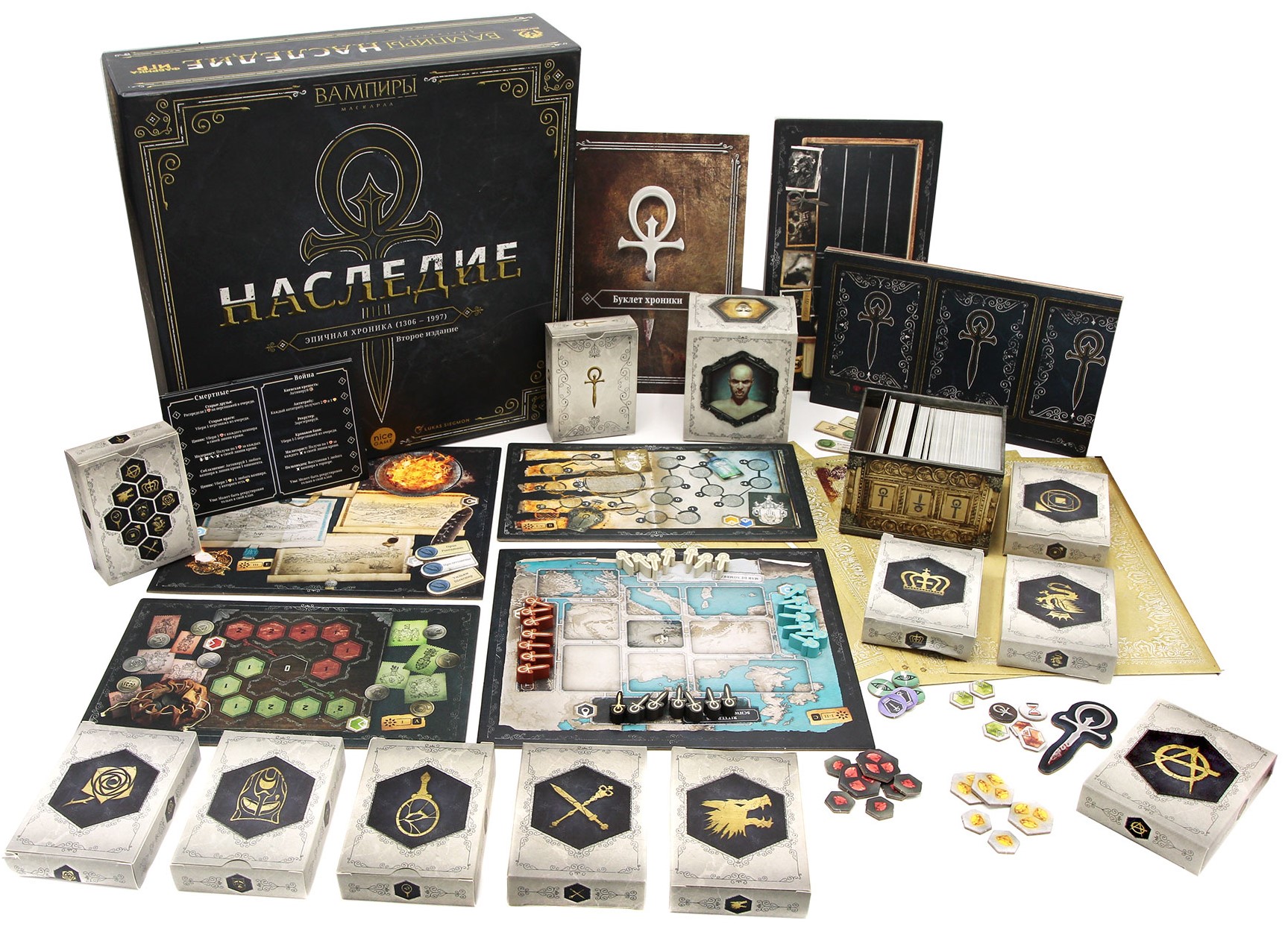 Herní set obsahuje: hrací deska, bojiště, karty základních postav, karty klanových intrik, karty postav kroniky, karty vůdců klanu, karty břemene, karty připomínek hráčů, karty výsledků kroniky, karty intrik bojiště, pravidla bojiště, karty událostí, dřevěné ankh, žetony aktiv, žetony darů, žetony klanů, žetony morálky klanů, žetony klanové politiky, žeton prvního hráče, ukazatel kola, žetony moci a slávy, žetony času, žetony titulů, žetony věrnosti, žetony sabatu, žetony vyšetřovatelů, útočiště, list postav, brožura kroniky, balíček kroniky, balíček průzkumu, archy se samolepkami, ochranné obaly, pravidla hry.