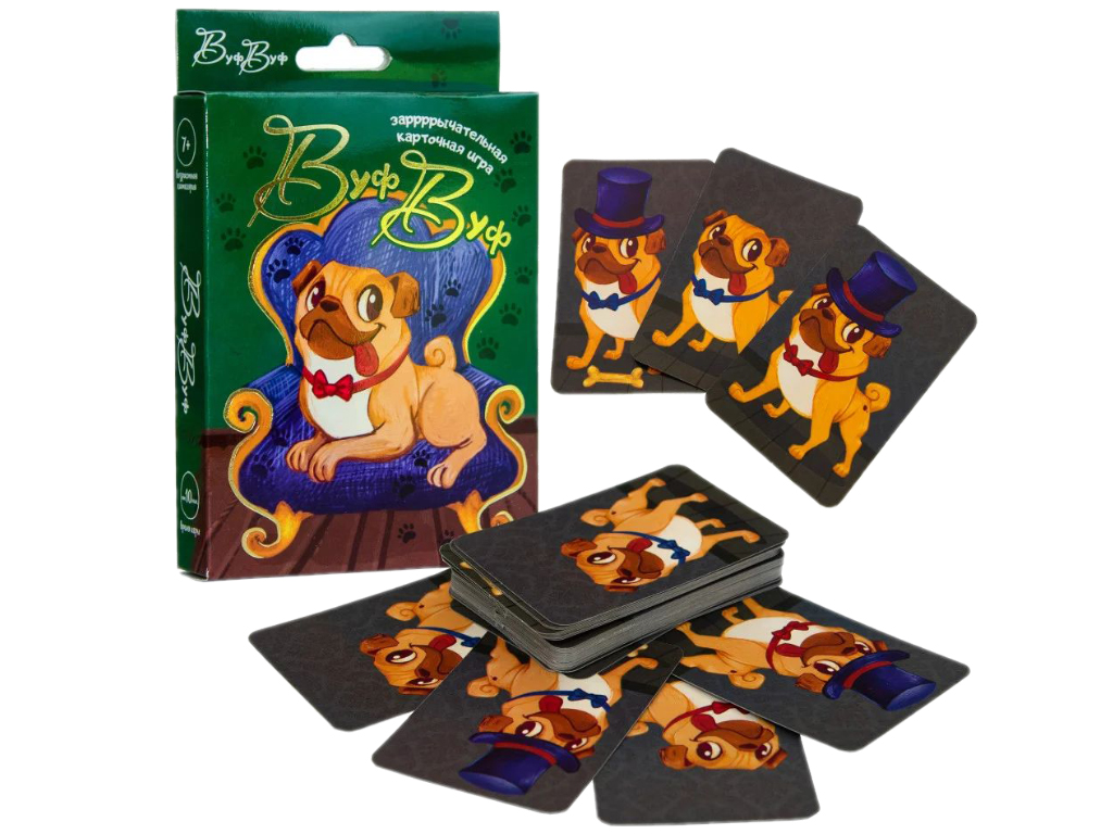 Stolní hra "Vuf-Vuf" (od 7 let) je zábavná karetní hra na rychlost a pozornost pro děti a dospělé. V této hře je třeba najít na kartách mopslíky s společnými znaky a získat je pro sebe.