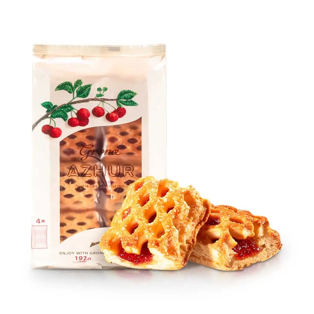 Sušenky lístkové „Ažur“ Grona s višňovou náplní — křupavé lístkové sušenky s šťavnatou višňovou náplní (37 %). Mají příjemnou sladkou chuť s lehkou ovocnou kyselinkou a křupavou texturu. Skvěle se hodí ke kávě nebo čaji jako sladká svačina.