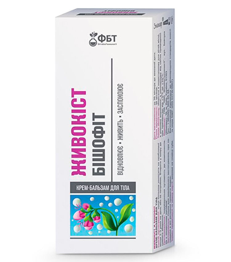 Krém-balzám pro tělo Živokost Bischofit se používá jako pomocné prostředek při léčbě onemocnění pohybového aparátu a nervosvalové soustavy (deformující artróza, revmatoidní artritida, radikulitida, osteochondróza, lumbago), stejně jako při ukládání solí. Bischofit je minerál přírodního původu, vytvořený před miliony let uložením starého moře. Je těžen ve formě solanky a poté je na povrchu odpařován do stavu soli. Dnes je známo několik velkých ložisek tohoto minerálu. Nejhlubší z nich se nachází pod Poltavou, kde je těžen v hloubce 2,5 km, a zdroj je velmi čistý. Účinnost minerálu je vysvětlena jeho složením, do kterého patří asi 70 mikroprvků, zejména hořčík, jód, brom, sodík, železo. Hořčík reguluje správné vstřebávání vápníku, čímž brání jeho hromadění v měkkých tkáních a kloubech. Tím podporuje zdraví páteře a zpevňuje kosti. Kromě toho mikroelement odstraňuje otoky a záněty kloubů, je proto nezbytný při léčbě a prevenci artritidy a artrózy, zmírňuje bolest a zánět svalů, uvolňuje je a pomáhá zvládat fyzické zatížení.