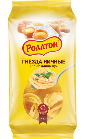 Těstoviny „Rollton“ hnízda vaječná po domácku — to jsou těstoviny nejvyšší kvality, vyrobené z mouky z tvrdé pšenice s přídavkem vaječného prášku. Mají tvar hnízd a balí se do balení po 400 gramech.