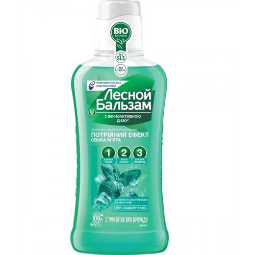 Ústní voda Lesní balzám s trojitým účinkem svěží máty zajistí extra svěží dech a doporučuje se pro každodenní péči o zuby a dásně. Produkt s mámou a extrakty z lesních bylin má trojitý účinek: chrání dásně před zánětem, má kariesprevenci a osvěžuje dech. Ústní voda Lesní balzám s imunologickým účinkem na bylinném odvaru přispívá k udržení imunity dutiny ústní a snižuje plak v ústní dutině až o 3krát.