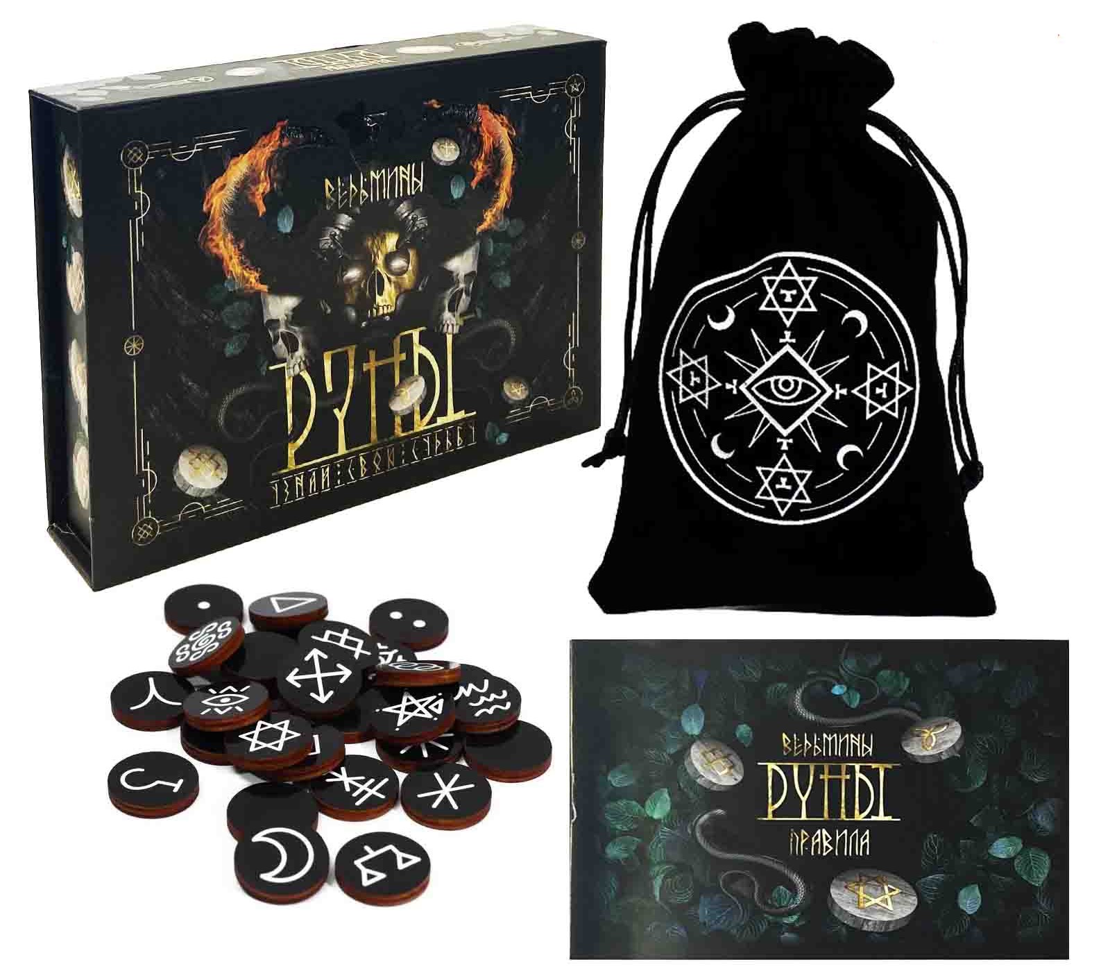 Obsah sady: 28 kusů run, sametový sáček, návod.