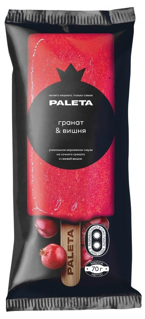 Zmrzlinové smoothie „Granátové jablko a třešeň“ 70g Paleta je osvěžující dezert vyrobený z přírodních bobulí třešní a granátového jablka. Zmrzlina kombinuje jasnou kyselost třešní a sladkost granátového jablka a vytváří bohatou a povzbuzující chuť. Toto zmrzlinové smoothie neobsahuje žádné umělé přísady ani konzervační látky, takže je nejen lahodnou, ale také zdravou volbou pro ty, kteří hledají přírodní možnosti.