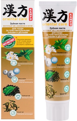 Unikátní bylinný aplikační systém, který absorboval staletí starou moudrost a kulturu japonského lidu. Zubní pasta Kampo Oriental Care je inspirována touto starodávnou filozofií a tradicemi Orientu: Japonské rostlinné extrakty jsou pečlivě vybírány a smíchány v optimálním množství, aby poskytovaly komplexní a efektivní péči o ústní dutinu. Výtažky z bílého a zeleného čaje mají antimikrobiální a regenerační účinek, obsahují velké množství antioxidantů. Extrakt z jasmínu má uklidňující a antistresový účinek na ústní sliznici. Mátový olej osvěžuje ústa, má stahující a protizánětlivé vlastnosti. Draselné ionty snižují citlivost zubní skloviny.